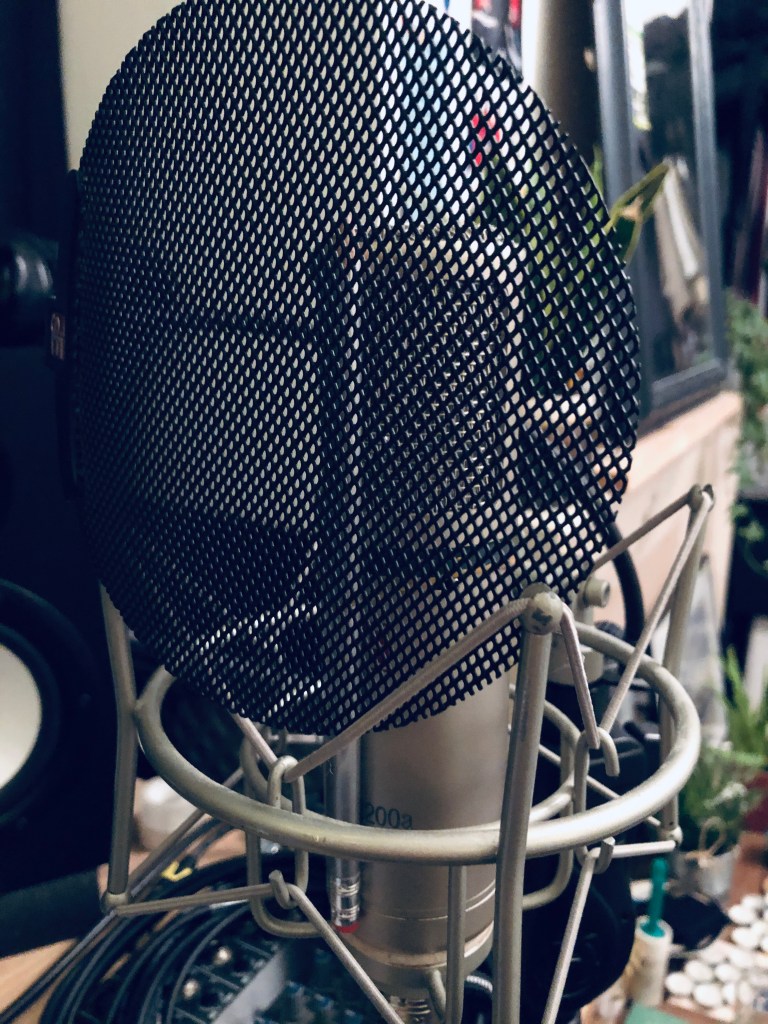 Also as you can see in the right hand side picture I have used an elastic band to tie a pencil round the microphone covering the centre of the grill. I do this to reduce as much sibilance as I can before having to use a De-Esser as sometimes I can find it can leave certain phrases feeling lifeless. It’s a trick i learned from a friend who is a producer/mix engineer. I have used this technique on most of my recordings since. All that it does is reduce the amount of air hitting the diaphragm of the mic.