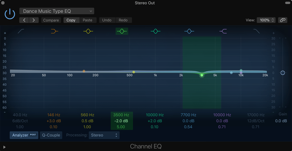 I used a a graphic EQ with a slightly tweaked version of the ‘Dance Music Type EQ’ preset. I can’t explain the full reasons as to why I use this on all my final bounces. I always have ever since I started using Logic Pro. I found it brings most of my mixes to life the best out of any other EQ out that I have experimented with. It essentially boosts everything just a tad and dips slightly at around 4k.