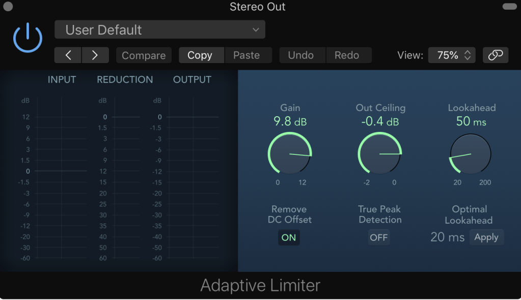 I also used an adaptive limiter set to out ceiling -0.4dB to ensure no clipping and the gain up to about 8dB to make sure each mix was a close to each other as possible in volume.